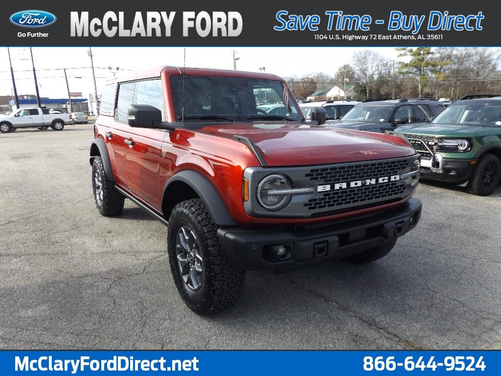2025 Ford Bronco Badlands 4WD with V6 2.7L gasoline engine, located in Athens, AL â" the best price available. This rugged and refined SUV blends off-road capability with everyday comfort. The powerful V6 2.7L delivers confident towing and spirited acceleration for highway cruising or trail adventures, while the advanced 4WD system and Badlands-tuned suspension handle rough terrain with precision.